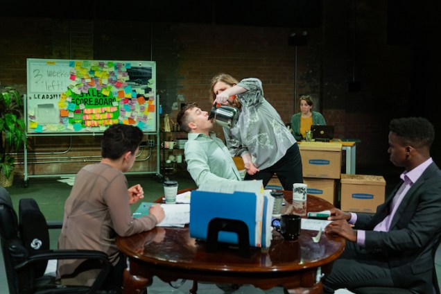 “The well-cast ensemble executes its broadly stereotypical roles with panache. Trevor Strahan nails his character Matt’s encroaching, The Wolf of Wall Street, seemingly coke-fueled madness. Mr. Strahan is all bug eyes and bulging veins in his expression of the dominant but threatened white male corporate psyche: all panicked, overt misogyny and latent racism. Shanna Sweeney’s Alice, the office’s saintly workhorse, injects her performance with just enough frayed anger to indict the character in the team’s moral and physical collapse.